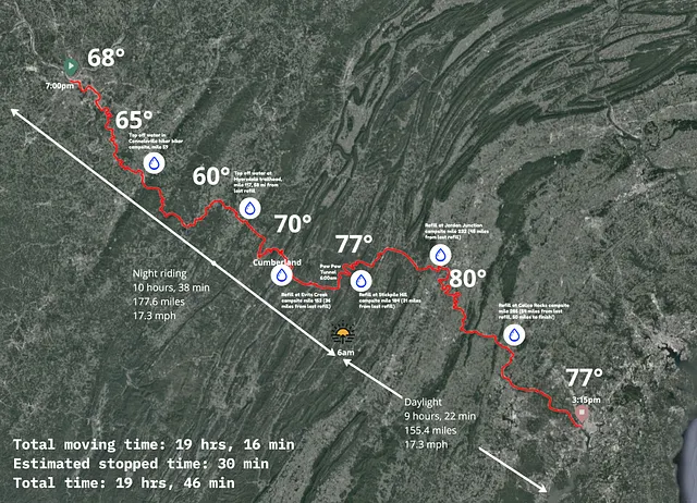 This was the plan until I learned that the shuttle for the Paw Paw Tunnel detour is mandatory — if the shuttle is running, you are required to take it. I would have been fine with taking the shuttle as it wouldn’t constitute any kind of competitive advantage over the record holders that didn’t have to take the detour, as the first half of the detour was still a hike-a-bike and the distance of the detour was much much longer than the tunnel itself. The issue though was that the shuttle only runs every 30 minutes. This made it completely not an option — I couldn’t risk arriving at the detour and having to wait around for the shuttle to arrive. Therefore I decided to start my ride even earlier so that I would arrive at the tunnel before the construction crews had started work for the day — ideally 6 am. This meant I would need to start my ride at 7 pm.