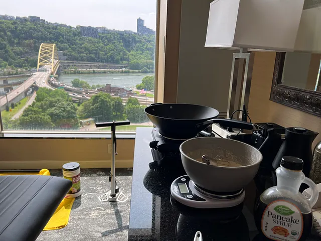 When I woke up my back was ever so slightly better. I immediately prepared breakfast, as I wanted to give myself my usual three hours to digest before riding. I followed the “don’t do anything different on race day” philosophy to the T. My favorite pre-training breakfast is pancakes, so in my suitcase, I had packed an electric hot plate, frying pan, pancake mix, syrup, tea kettle, and yerba matte.