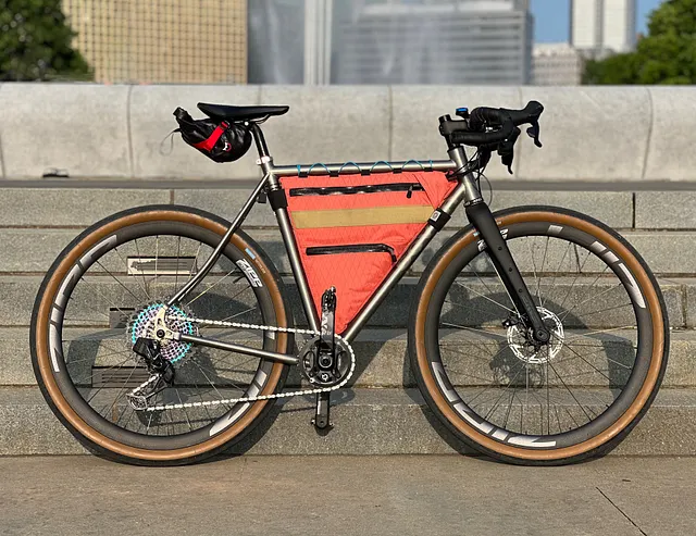 Some build details: clearance for up to 700c x 55mm with fenders, moto seat stays for extra compliance, internal wire routing for rear dynamo powered light, Zipp 303 firecrest wheels, SON dynamo hub, Enve adventure fork, SRAM Eagle AXS derailleur, 10–52 Eagle cassette, AXS rival road shifters with hydraulic brakes, 38t front chainring, Fizik Argo saddle, Ritchey Comp Beacon XL bars, K-lite Ultra v2 Gravel dynamo powered lighting system with a rear cube. For the FKT I ran Rene Herse Hatcher Pass (48mm) in endurance casing.