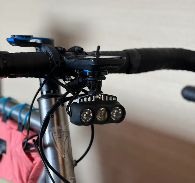 My cockpit consisted of a stem mount for a Wahoo Roam, with an integrated GoPro mount underneath for the dynamo-powered K-lite headlight. For race day I added a Quadlock mount for my phone so that I could easily access it for referencing cue sheets, playing music, etc, without the risk of dropping it (and being slowed down by needing to stop to get it).